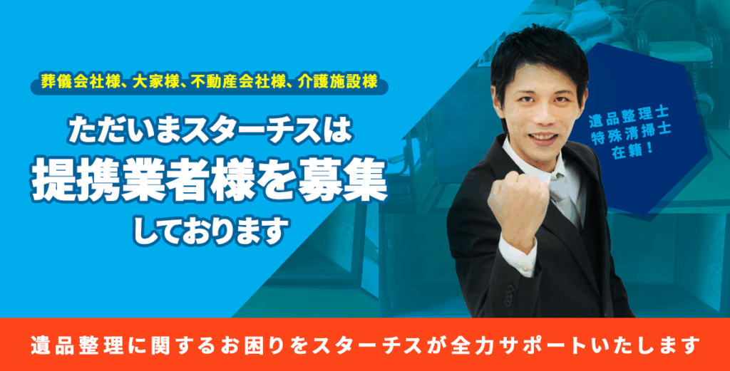 スターチスでは遺品整理や生前整理、特殊清掃などのサービスの後共にお客様をサポートして頂ける不動産会社様、リフォーム会社様介護施設様、葬儀社様、司法書士様などの提携業者様を日々模索しております。
